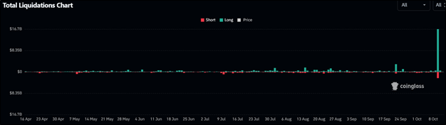 Всего за 10 октября в криптовалюте было суммарно ликвидировано лонговых (на покупку) маржинальных позиций (тех, где использовалось кредитное плечо) на сумму $16,7 млрд. Это в восемь раз больше, чем за предыдущие девять торговых дней октября.