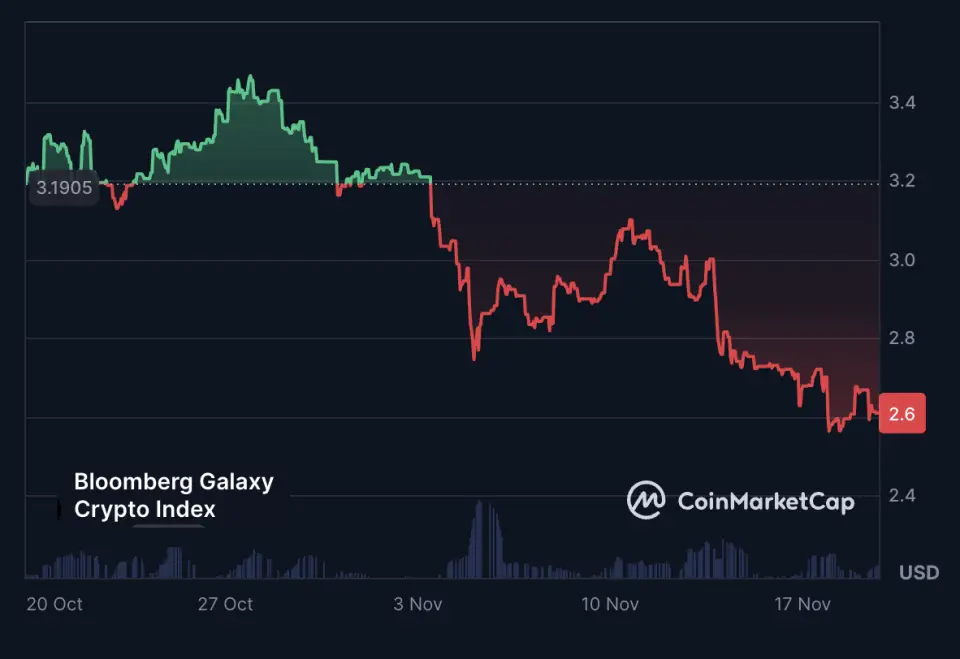 19 ноября цена первой криптовалюты стабилизировалась на уровне $92 000 с ростом на 0,57%, но индекс криптовалют Bloomberg Galaxy потерял сразу 14%.