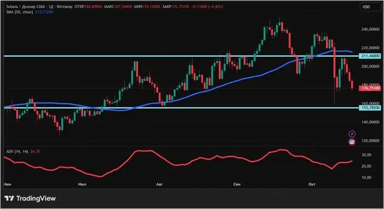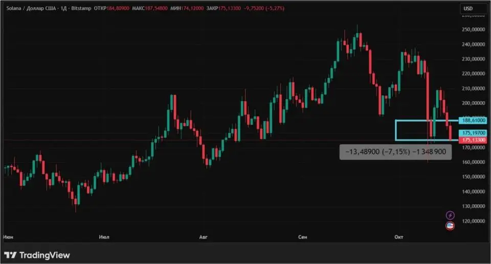 Solana с 10 по 17 октября потеряла 7,15%. Во второй половине недели цена криптовалюты опустилась с $211 до $175. За последние четыре торговые сессии падение в процентном соотношении увеличивалось день ото дня.