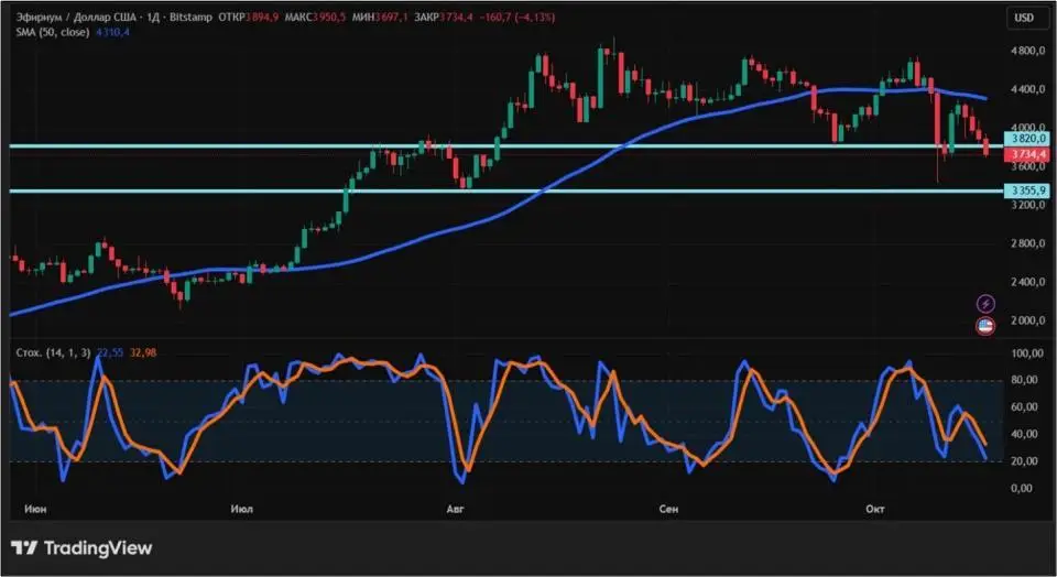 С точки зрения технического анализа, тренд эфира — нисходящий. Об этом говорит расположение цены ниже 50-дневной скользящей средней (обозначена синим цветом). Преобладание медведей подтверждается снижающимся стохастиком, который не дошел до зоны перепроданности. Ближайшие уровни поддержки и сопротивления по дневному графику: $3355,9 и $3820 соответственно.