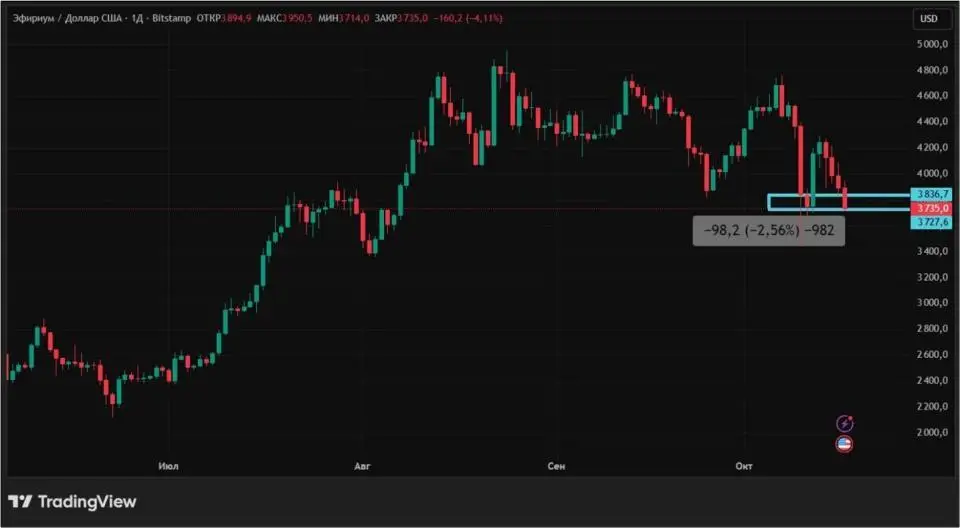 Эфир с 10 по 17 октября упал на 2,56%. Как и в случае с биткоином, ETH рос в начале недели. Однако четыре минусовые сессии подряд, с 14 по 17 октября, увели стоимость второй по капитализации криптовалюты ниже $4000.