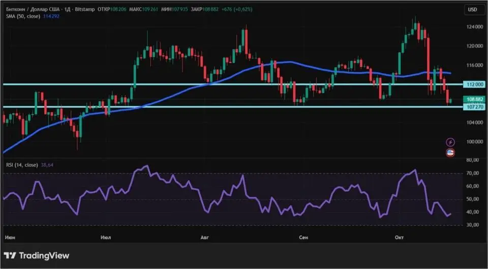 С точки зрения технического анализа, тренд биткоина — нисходящий. В пользу этого свидетельствует расположение цены ниже 50-дневной скользящей средней (обозначена синим цветом). Медвежьи настроения инвесторов подтверждаются и данными RSI. Этот осциллятор уже опустился ниже уровня 50 и продолжает падение. До зоны перепроданности (ниже 30) он еще не добрался, что тоже не сулит покупателям (быкам) чего-то позитивного. Сейчас BTC пришел к зоне поддержки, сформированной еще в конце августа и начале сентября — в районе $107 000-$108 000. Если удержаться выше не удастся, скорее всего распродажи продолжатся. Говорить о смене тренда стоит только после того, как биткоин поднимется выше ближайшего по дневному графику уровня сопротивления — около $112 000.