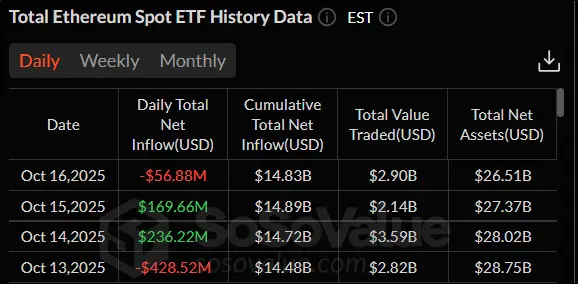 В отличие от спотовых ETF на биткоин, биржевые фонды на эфир продемонстрировали смешанную динамику: приток и отток денежных средств был зафиксирован на неделе по два раза. Кумулятивный денежный поток оказался отрицательным, – $79,53 млн.