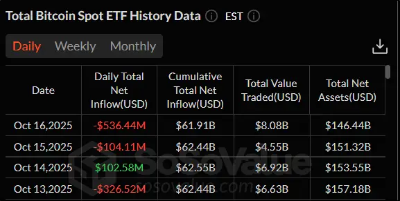 Спотовые ETF на биткоин также демонстрируют отрицательную статистику. В трех торговых сессиях из четырех биржевые фонды фиксировали отток денежных средств. Суммарно он составил более $850 млн. Лишь во вторник, 14 октября, случился приток денег в спотовые BTC-ETF размером $102,58 млн. Тем не менее общей негативной динамики он изменить не смог.