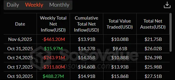 Негатив наблюдается и у владельцев спотовых ETF на эфир. По итогам четырех торговых сессий на прошедшей неделе зафиксирован отток денежных средств размером $461,2 млн. Это худший показатель с конца сентября. Всего за последние четыре недели в трех случаях наблюдался отток денег из спотовых биржевых фондов на эфир.