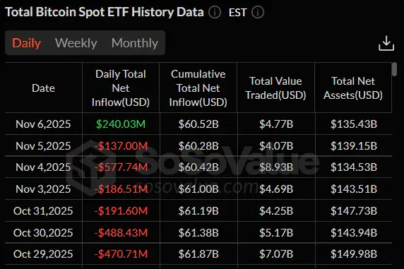 Цифры Сондерса подтверждаются статистикой спотовых ETF на BTC. Биржевые фонды на прошедшей неделе фиксировали отток денежных средств в трех сессиях. Всего инвесторы изымали деньги из фондов на протяжении шести дней подряд, с 29 октября по 5 ноября включительно. Это самая длинная серия с августа. Можно констатировать, что уверенность инвесторов в дальнейшем росте BTC упала.
