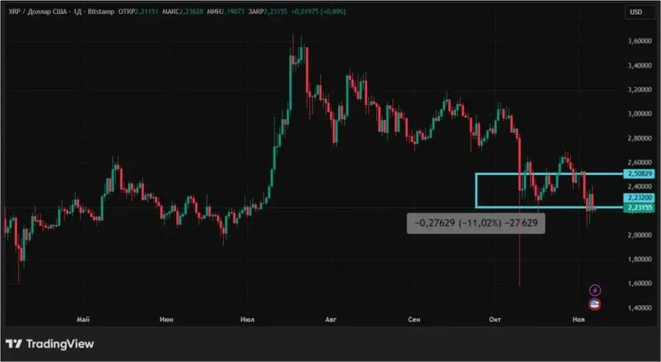 Криптовалюта компании Ripple за неделю с 31 октября по 7 ноября упала на 11%. В отличие от биткоина и эфира, XRP не смогла обновить свой минимум даже за последний месяц. Из семи торговых сессий на неделе три закончились в плюсе и четыре в минусе.