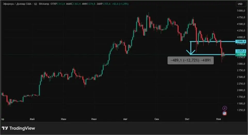 Эфир за период с 31 октября по 7 ноября потерял 12,72% стоимости. 4 ноября ETH опускался ниже $3100. Этого со второй по капитализации криптовалютой не происходило более трех месяцев, с 15 июля.