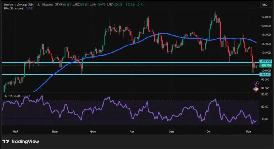 С точки зрения технического анализа, тренд биткоина — нисходящий. Цена находится ниже 50-дневной скользящей средней (обозначена синим цветом). RSI также опустился ниже уровня 50, однако до зоны перепроданности до сих пор не добрался. Уровни поддержки и сопротивления на дневном графике: $98240 и $103 530 соответственно.