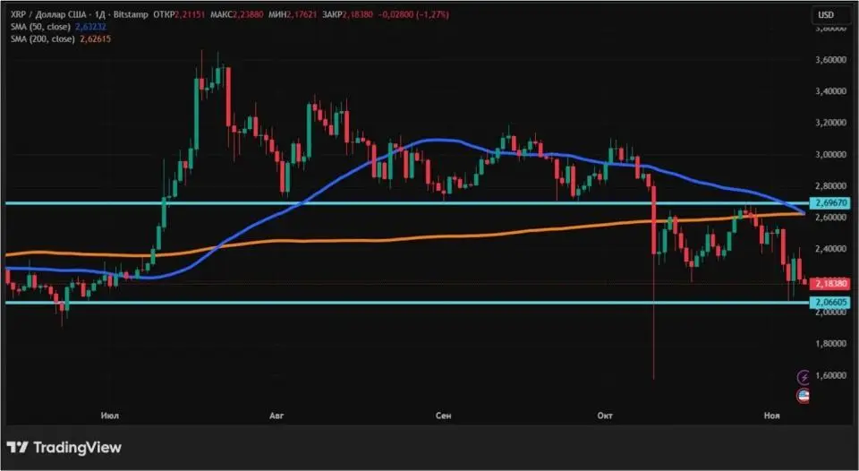 С точки зрения технического анализа, тренд у XRP негативный. Криптовалюта близка к формированию креста смерти — ситуации, когда медленная 200-дневная скользящая средняя (обозначена оранжевым) пересечет быструю 50-дневную (обозначена синим) снизу вверх. Естественно, цена XRP находится ниже обеих линий. Ближайшими уровнями поддержки и сопротивления выступают отметки $2,07 и $2,7 соответственно.