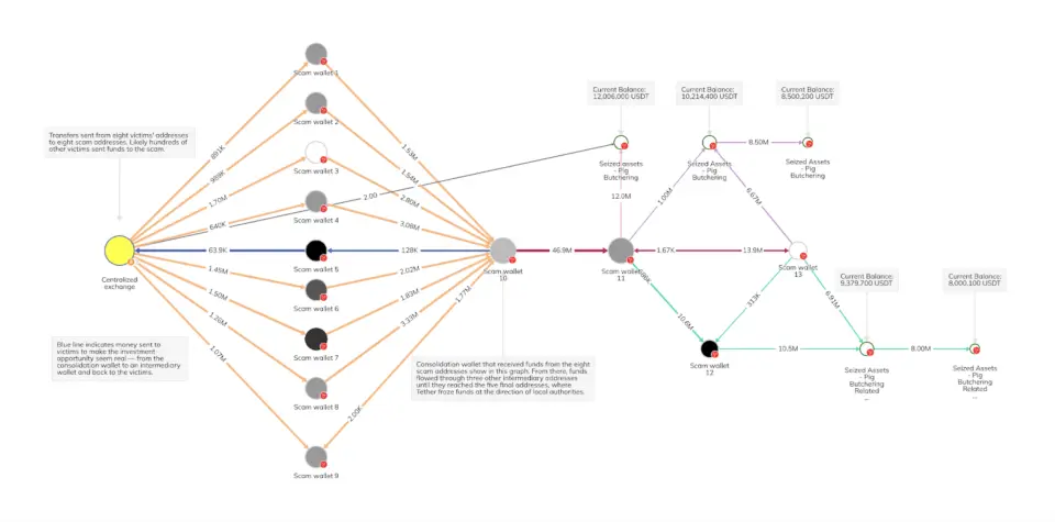 В Chainalysis рассказали, что после получения первичных данных от местных властей криптовалютные компании провели анализ транзакций подозреваемых и вышли на счета, подконтрольные организаторам мошеннических схем. Эксперты Chainalysis при посредстве бирж ОКХ и Binance смогли выявить промежуточные адреса и сузить список до пяти основных кошельков, куда стекались украденные у жертв средства.
