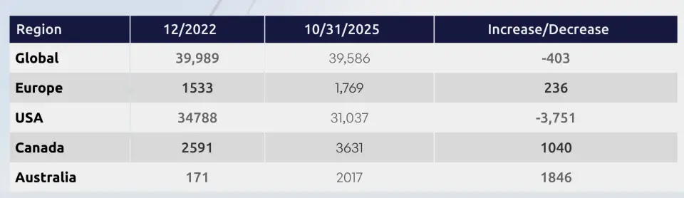 В общем рейтинге по темпам прироста с декабря 2022 года по октябрь 2025-го лидируют Канада и Австралия. Эти страны нарастили свои сети на 1040 и 1846 устройств соответственно.