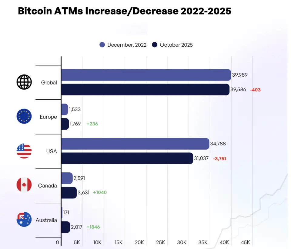 По числу установленных с начала года новых криптоматов лидирует Северная Америка с долей свыше 83% от глобальной сети. В США было установлено 360 новых криптоматов, что довело общее число устройств до 31 037. Канада добавила 44 новых устройства.