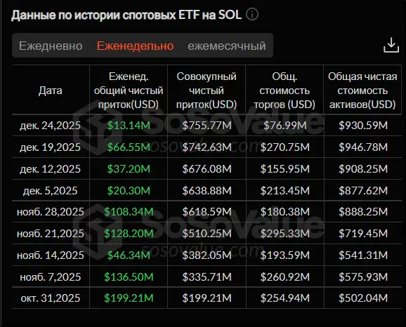 Новостной фон для Solana неоднозначен. С одной стороны, спотовые ETF на SOL зафиксировали серию из пятнадцати торговых сессий притока денежных средств подряд. С другой, размер вливаний инвесторов в спотовые биржевые фонды на Solana не идет ни в какое сравнение с аналогичными фондами на биткоин и эфир. За прошедшие на этой неделе три торговые сессии объем вложенных средств составил скромные $13,14 млн. Кстати, если смотреть в семидневном разрезе, то еще ни разу спотовые ETF на SOL не зафиксировали отток денег.