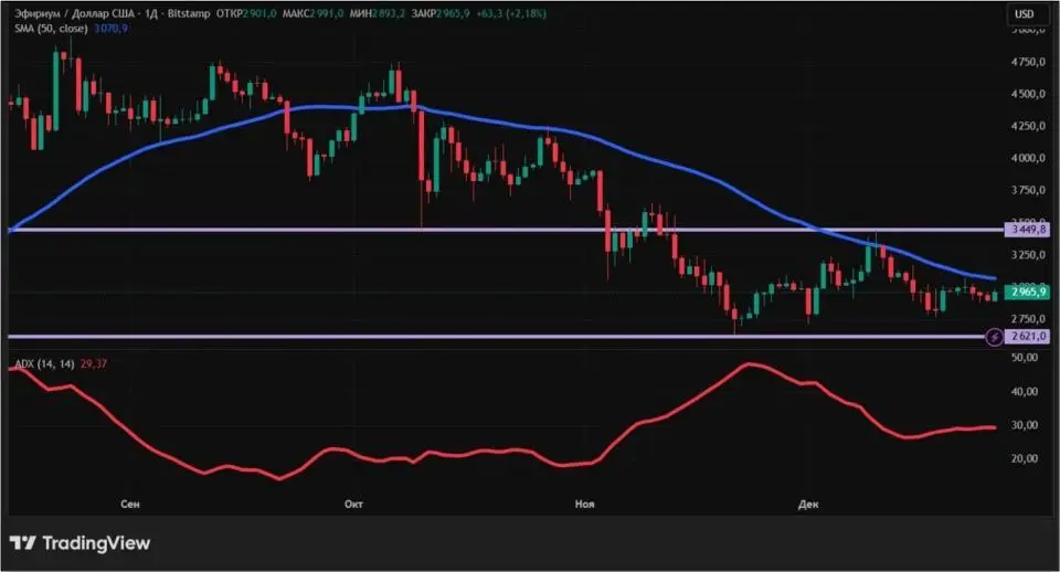 С точки зрения технического анализа, эфир остается в нисходящем тренде. Об этом говорит расположенная ниже 50-дневной скользящей средней (отмечена синим цветом) цена. А вот сказать, что медведи наращивают давление, нельзя. Индикатор ADX вот уже вторую неделю дрейфует около 30. Ближайшие уровни поддержки и сопротивления на дневном графике: $2621 и $3449,8 соответственно.