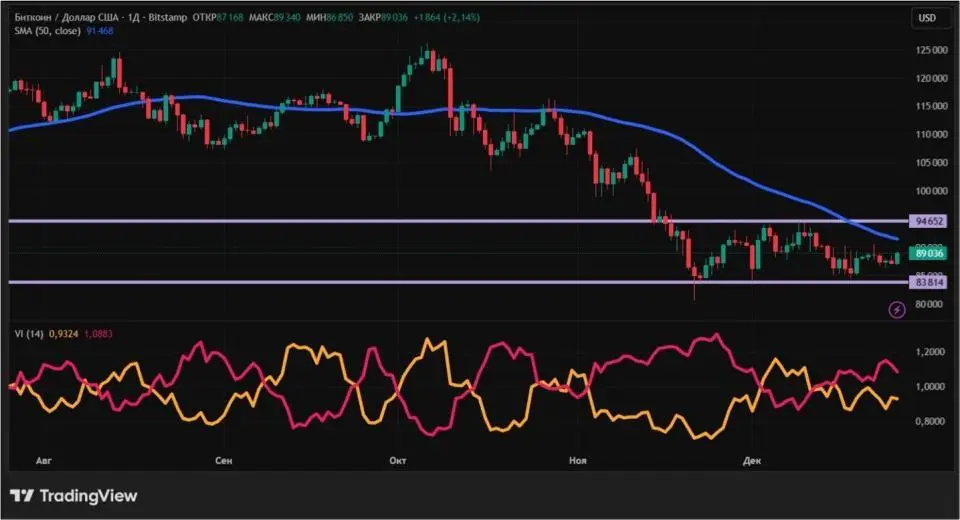 С точки зрения технического анализа, тренд биткоина остается нисходящим. Во-первых, это следует из цены, расположенной ниже 50-дневной скользящей средней (отмечена синим цветом). Во-вторых, подтверждением продолжения медвежьего тренда выступает индикатор Vortex, линия VI-(розовая) которого превышает VI+ (оранжевую). Уровни поддержки и сопротивления на дневном графике по сравнению с прошлой неделей не изменились: $83814 и $94652 соответственно.
