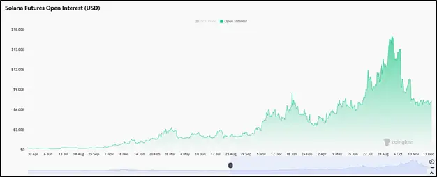 А вот в отношении открытого интереса дела обстоят куда как хуже. С сентябрьского исторического максимума $17,1 млрд показатель обвалился на 58%. Интерес инвесторов к деривативам на Solana, в частности на фьючерсы, явно ослабел. Из позитивных моментов можно отметить такой: в диапазоне от $6,6 млрд до $7,5 млрд показатель находится уже почти полтора месяца. Иными словами, ниже открытый интерес по фьючерсам на Solana не опускается.