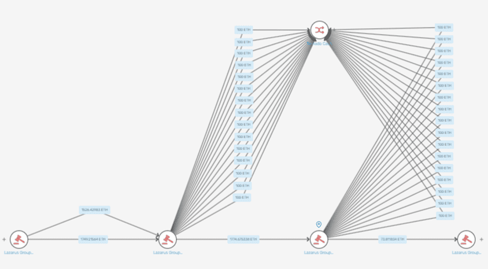 2. Миксеры: массовый прогон через Tornado Cash для разрыва цепочек. Несмотря на санкции, инструмент работает и остается в активном арсенале преступников.