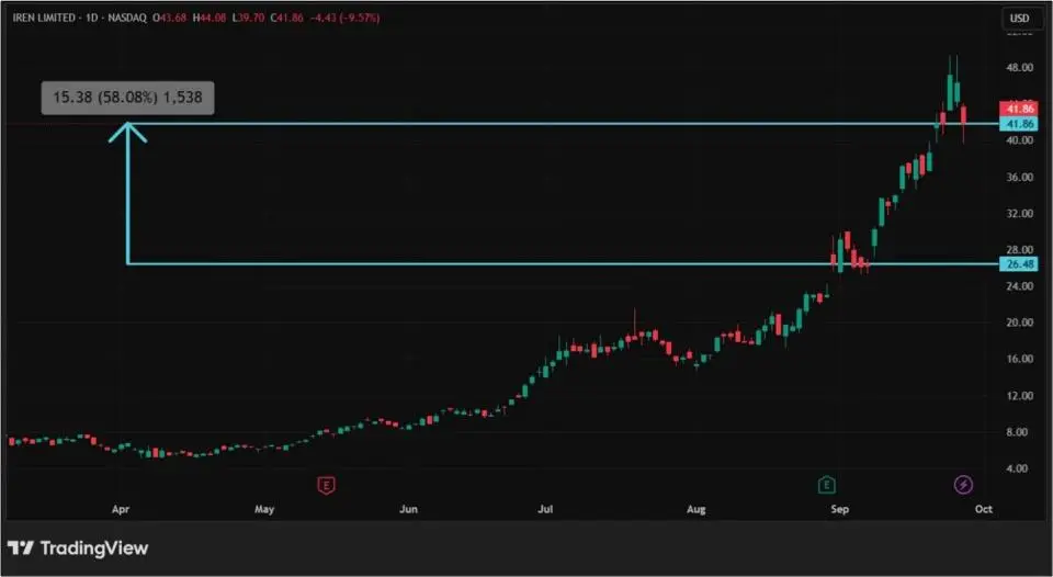 На седьмом месте расположилась компания из Сиднея IREN, занимающаяся майнингом и развитием дата-центров с рыночной капитализацией $11,38 млрд. В сентябре 2025 года ее акции продолжили взрывной рост, который составил 58,08%. Основной причиной такого развития событий стало массовое партнерство крупных компаний с организациями, предоставляющими инфраструктуры дата-центров. В начале месяца появилась новость о коллаборации Microsoft с Nebius Group, а в конце — о договоренностях Nvidia с OpenAI. Напрямую IREN эти новости не затронули. Тем не менее, интерес крупного капитала к организациям из ее отрасли привлек внимание инвесторов и к акциям этой австралийской компании.