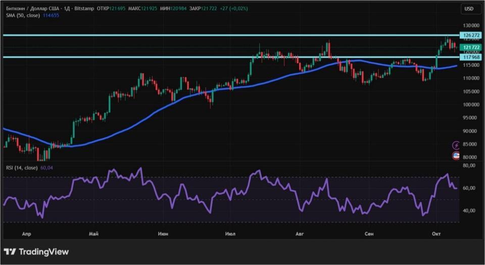Биткоин с 3 по 10 октября 2025 года снизился в цене на 0,82%. В понедельник, 6 октября, первая по капитализации криптовалюта добилась нового исторического максимума, впервые достигнув отметки $126 272.