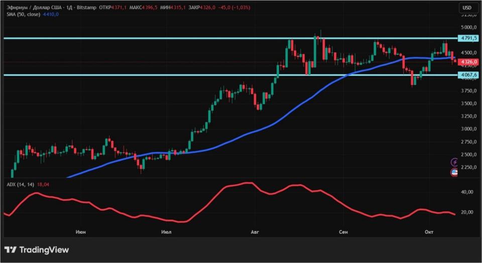 С точки зрения технического анализа, эфир продолжает дрейф между уровнем поддержки $4067,6 и уровнем сопротивления $4 791,5, редко выходя за пределы. Сейчас некоторую инициативу захватили продавцы (медведи), учитывая, что цена расположена ниже 50-дневной скользящей средней (обозначена синим цветом). Слабая выраженность тренда подтверждается низким значением индикатора ADX (18,04).