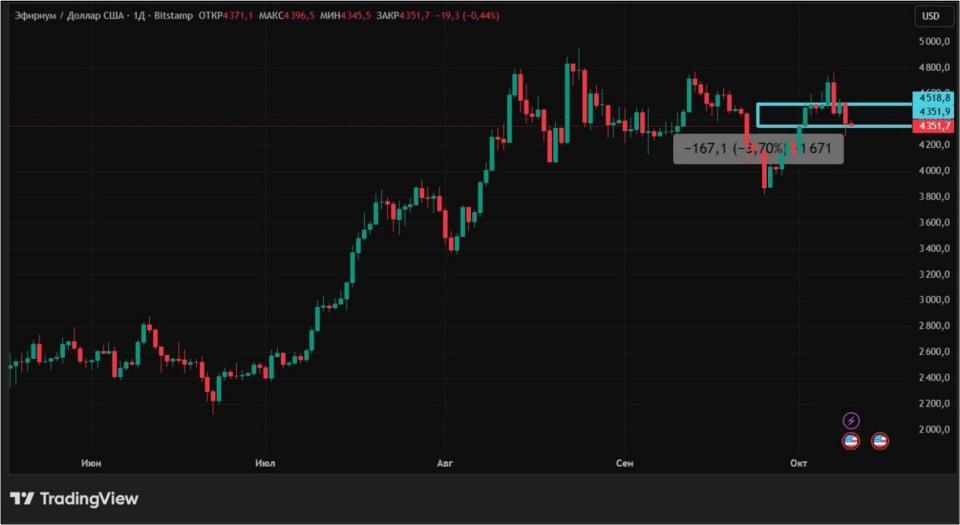 Стоимость эфира с 3 по 10 октября упала на 3,7%. Неудачной для ETH стала вторая половина недели, когда и произошла коррекция. В начале же все складывалось успешно: эфир превысил отметку $4700 впервые за 24 дня.