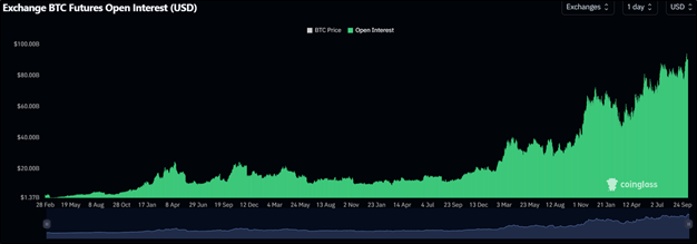 Исторический максимум BTC сопровождался историческим максимумом открытого интереса к биткоин-фьючерсам. Денежное выражение срочных контрактов на биткоин во вторник, 7 октября, впервые достигло $94,12 млрд.