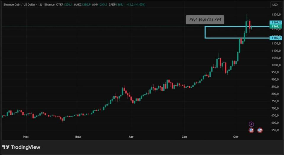 BNB, нативная монета биржи Binance, с 3 по 10 октября выросла на 6,67%. Как и биткоин, Binance Coin обновил за прошедшие семь дней свой исторический максимум. Знаменательное событие произошло во вторник, 7 октября, когда коин BNB достиг отметки $1355,1.