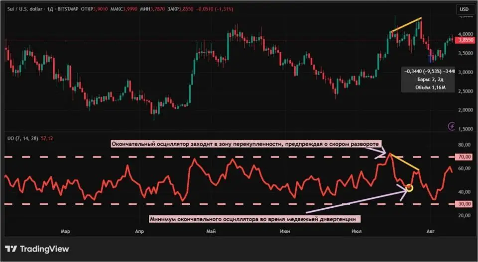 Сначала воспользуемся дневным графиком Sui с биржи Bitstamp. В июле 2025 года эта криптовалюта выросла до своих полугодовых максимумов. Окончательный осциллятор зашел в зону перекупленности еще 15 числа. Таким образом был выполнен первый необходимый пункт медвежьего сигнала. К 28 июля цена продолжила свой рост, однако индикатор новых максимумов не показал. Это стало вторым необходимым пунктом. Пробитие минимума окончательного осциллятора (третий сигнал) произошло 31 июля. Через два дня Sui опустилась еще на 9,53%.