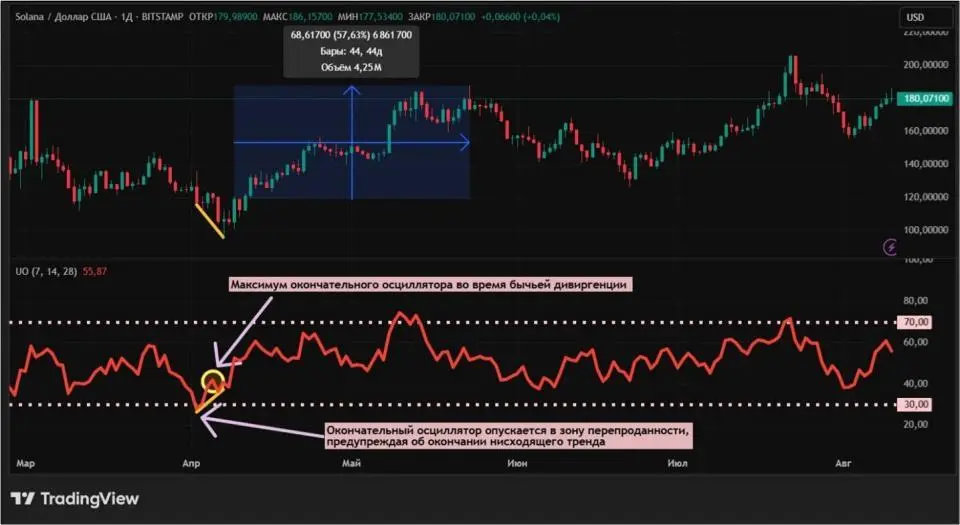 Воспользуется дневным графиком Solana на бирже Bitstamp. Весь март 2025 года криптовалюта SOL снижалась в цене. Падение продолжалось до 7 апреля. Тем не менее, окончательный осциллятор опустился в зону перепроданности уже 2 апреля. Таким образом было реализовано сразу два из трех необходимых условий.