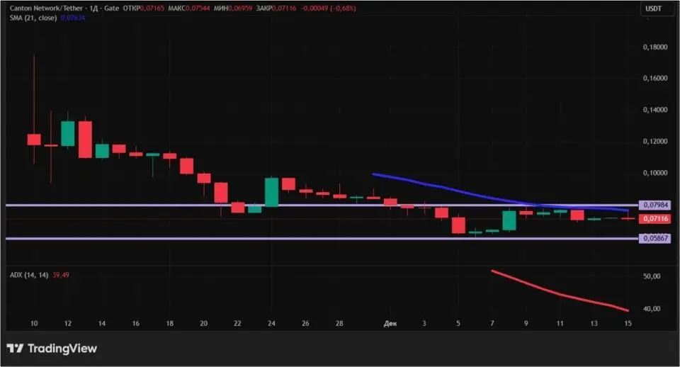 Чтобы говорить о перехвате инициативы покупателями у продавцов, необходимо закрепиться выше уровня сопротивления $0,07984. А вот если CC опуститься ниже уровня поддержки $0,05867, то нисходящий тренд только усилится. Также поддержку Canton Network может оказать общий рост крипторынка, в особенности крупных криптовалют: биткоина, эфира, Solana и прочих.
