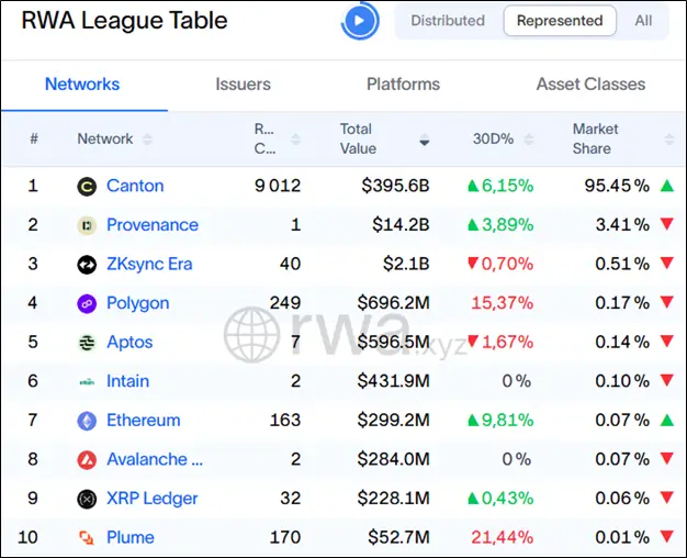 На декабрь 2025 года Canton — это проект, который тесно связан с сектором токенизации реальных активов (RWA). По показателю, в котором блокчейн используется как инфраструктура учета — Represented RWA, — активов в Canton отражено на общую сумму в $395,6 млрд.